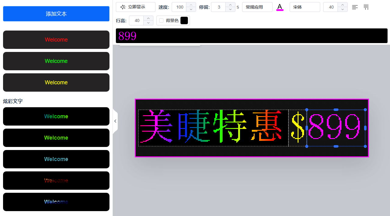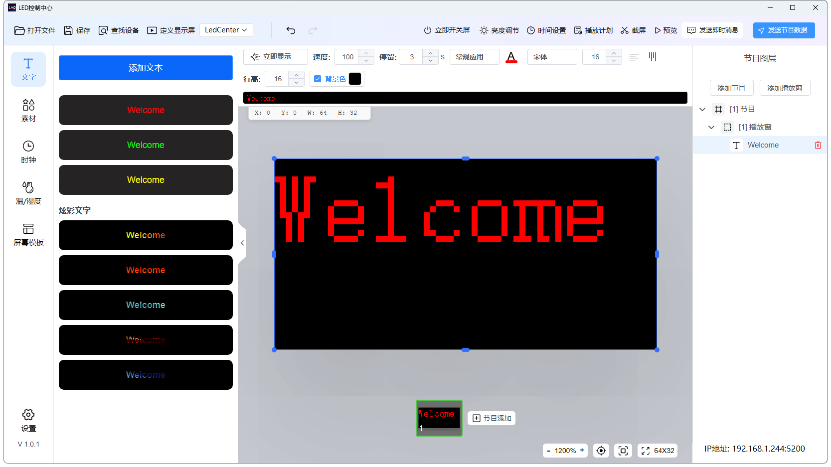 新版软件秉承“所见即所得”的直观设计理念,在保持一贯高效、稳定、功能强大的内容制作基础上,进一步优化了人机交互与操作流程,持续引领行业专业控制软件的标准。 ![]() 产品简介LedCenter控制中心软件,设计简洁直观,操作流畅易用。用户可轻松创建、编辑与管理专业LED节目,支持多窗口布局、图文动画混合编排及丰富的播放特效。 “新版本凝聚我们多年积累的用户反馈与研发经验,是流明电子在LED控制软件领域的集大成之作。它在完美适配新一代硬件的同时,也为现有设备持续赋能,进一步提升使用价值。 软件功能与特点多语言自由切换 简体中文、繁体中文、英文。 ![]() 结构化节目内容管理 采用直观的树状结构,对节目、播放窗口、播放项进行分层组织与管理,逻辑清晰,层级分明,极大提升了多节目、多窗口编排与维护的效率。 ![]() 播放窗口自由分割 最多可同时播放十六个窗口,各窗口支持独立播放。 ![]() 强大的文本编辑功能 具备专业级的字库管理与文本处理能力,精细调节字号、颜色、排版,确保各类文字内容在屏幕上清晰呈现。 ![]() 可自定义上传素材 兼容多种主流文件格式,包括视频(如AVI、MP4等)、图片(如JPG、PNG、BMP等)及动态图像(如GIF、SWF等)。 ![]() 丰富的动态显示效果 提供超过60种专业动画特效,涵盖移入、滚动、展开、百叶、飘雪等多种基础及高级动画类型,并支持窗口独立边框样式设定。 ![]() 内置专业的时钟节目编辑功能 支持在节目中直接添加与编辑数字时钟或模拟表盘,可自由设定样式、位置与显示效果,轻松实现各类时间信息的高效呈现。 ![]() 环境温湿度信息显示 支持接入外置温度传感器,可将实时环境温度数据作为独立的节目内容进行编辑与播放,适用于需要实时环境监测与信息发布的各类应用场景。 ![]() 即时发布与应急插播 软件提供“即时节目”发送按钮,可发送临时通知、紧急信息等即时节日内容,实时插入当前播放列表,确保重要信息能够第一时间准确传达至屏幕。 ![]() 智能亮度管理 软件提供精细化的屏幕亮度调节方案,支持手动即时调整、基于时间计划的定时调节(可设置不同时间段的亮度值),以及根据环境光照自动适应的智能调节模式(需搭配光敏传感器)。 ![]() 精准播放控制与计划管理 软件提供节目级“限时段播放”设置,可精确控制每个节目的生效日期与时间段。更配备专业的播放计划编排功能,支持基于日期的节目表创建、多计划任务管理,实现全年自动化、精准化的播出控制。 ![]() 还在犹豫什么?快来使用吧! |